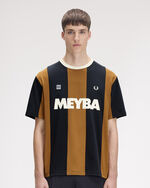 Quintessential Fred Perry sportswear with bold Meyba branding that replicates the layout and language of football kits. Back of the net.