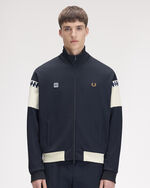 The signature Fred Perry Track Jacket, remade with a colour block cut-and-sew construction that echoes old-school sportswear aesthetics.